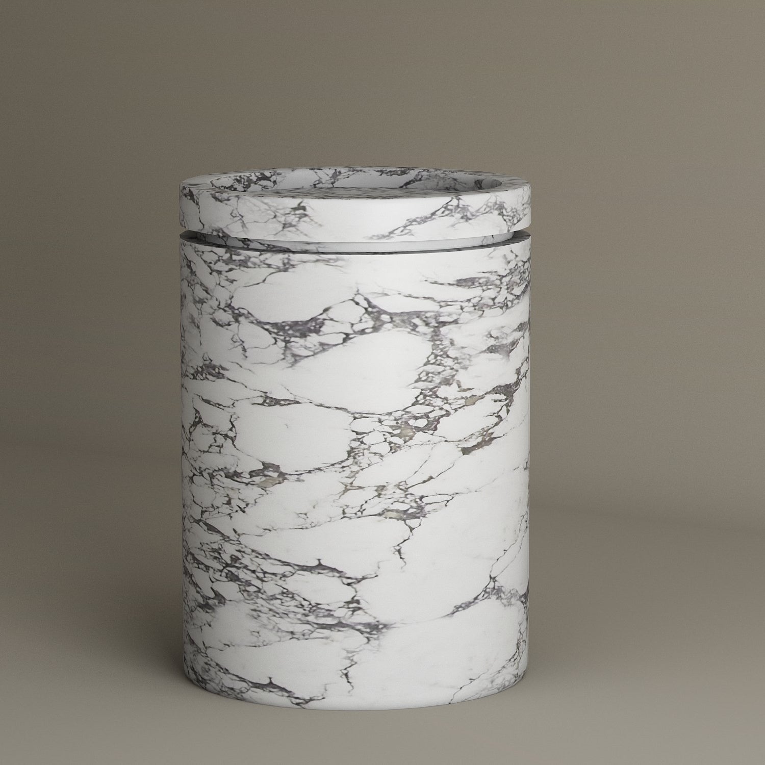 A Calacatta Viola marble end table with hidden storage and a lift lid designed for modern living rooms needing clean organization.
