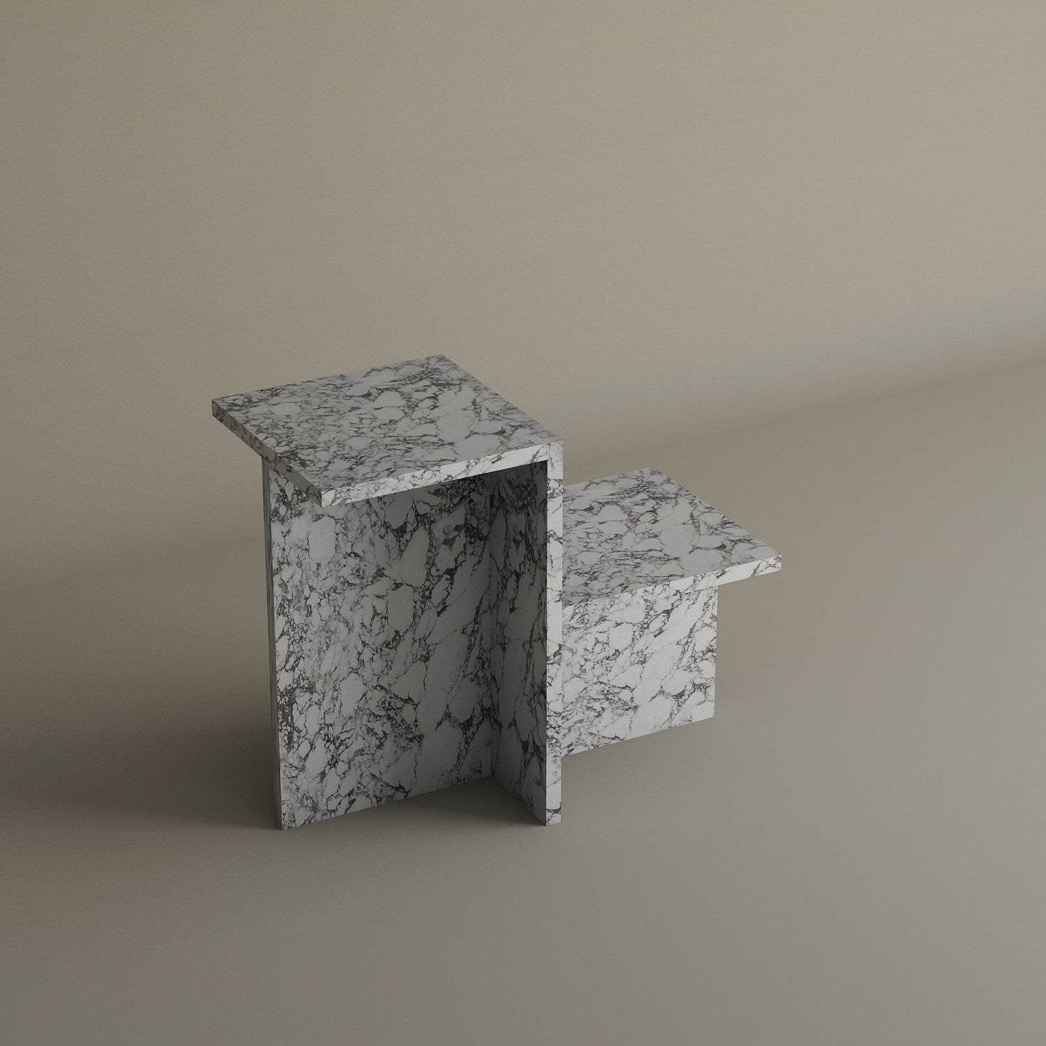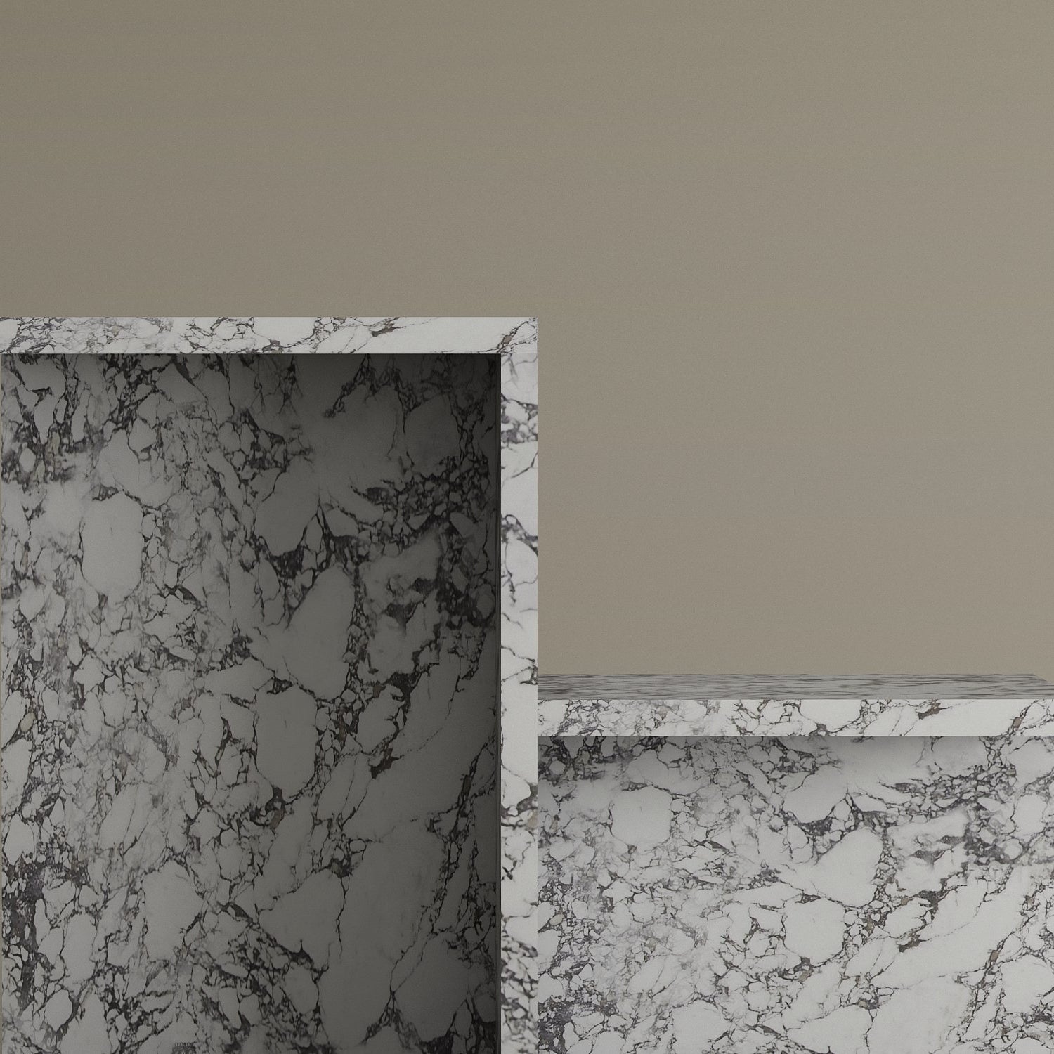 A layered Calacatta Viola marble table set designed for flexible styling and visual depth.