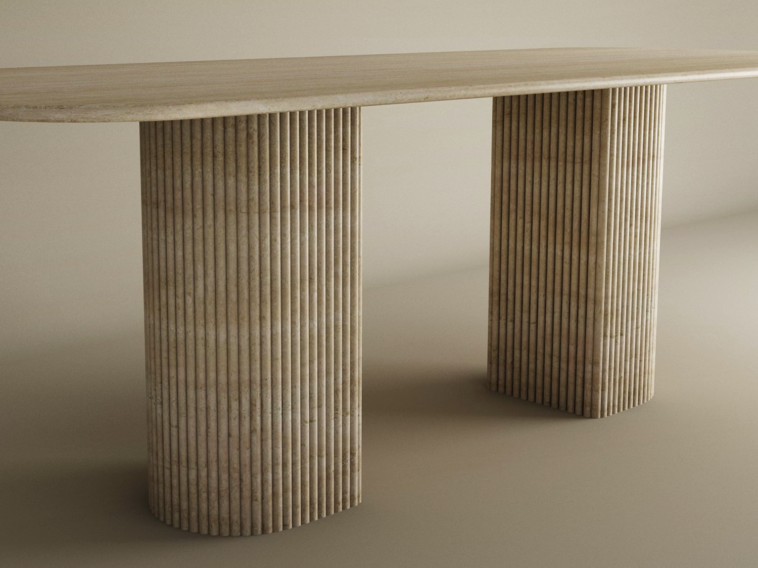 Bring a sense of calm and longevity and heirloom quality to your home with this rectangular travertine dining table, paired with a fluted round base. The natural stone tabletop is a testament to timeless design, with its gentle veining and warm tones that invite gathering and connection.
