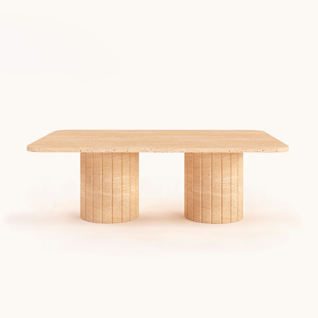 Crafted with 100% organic stone, this table embodies the raw beauty of nature. Each angle offers a new perspective, highlighting the unique veining and rich textures of the travertine. The table’s fluid design and sturdy cylindrical bases merge strength with elegance, anchoring the room in style while inviting continuous admiration from all who encounter it.