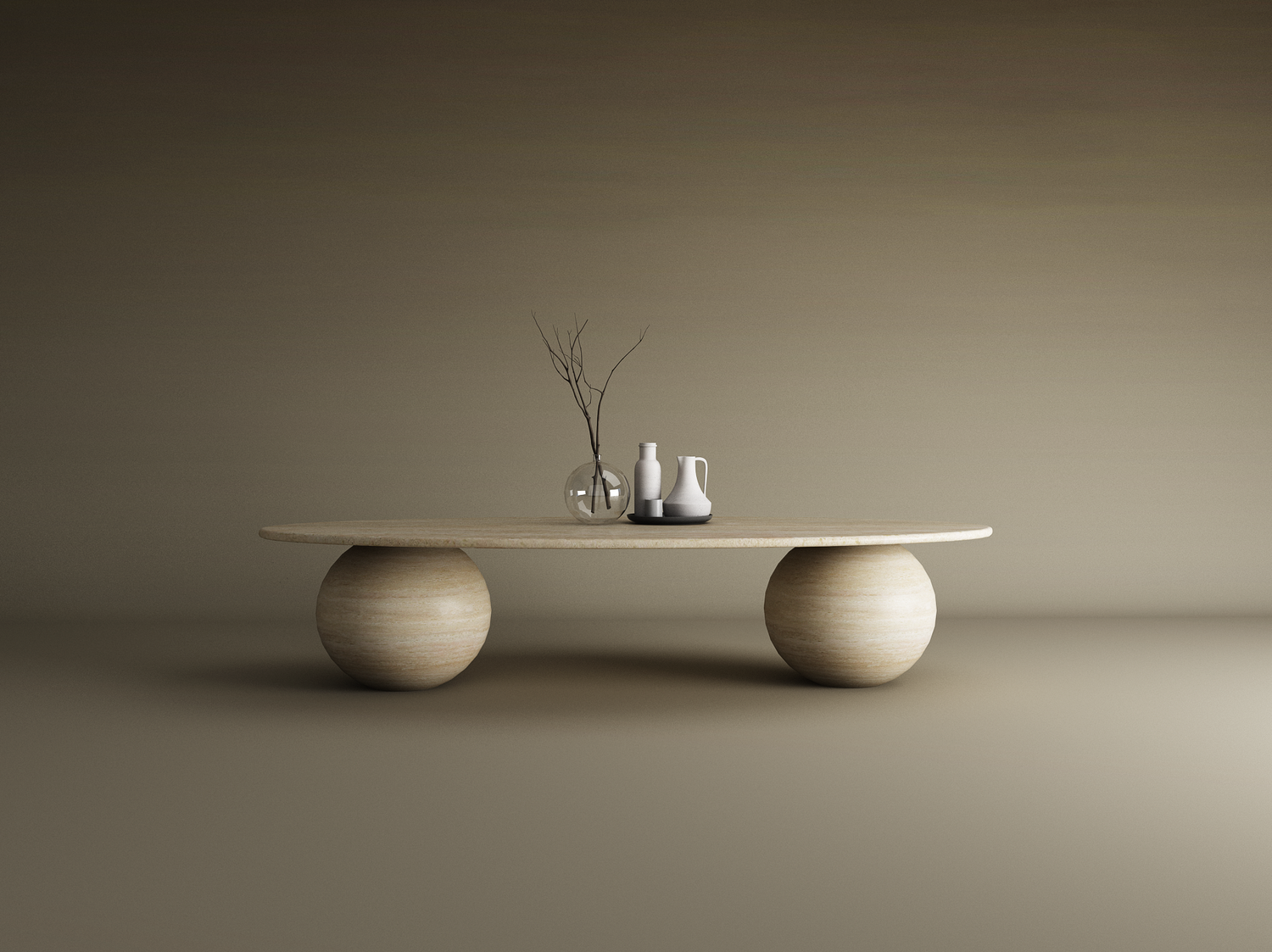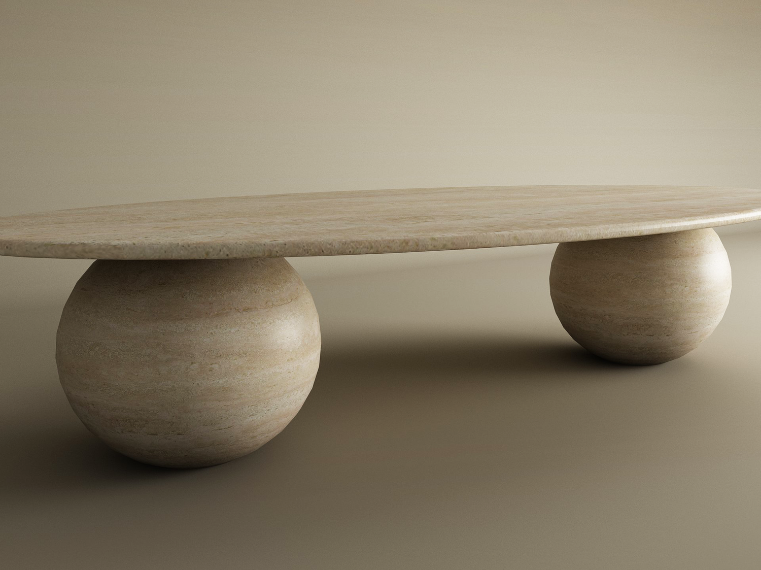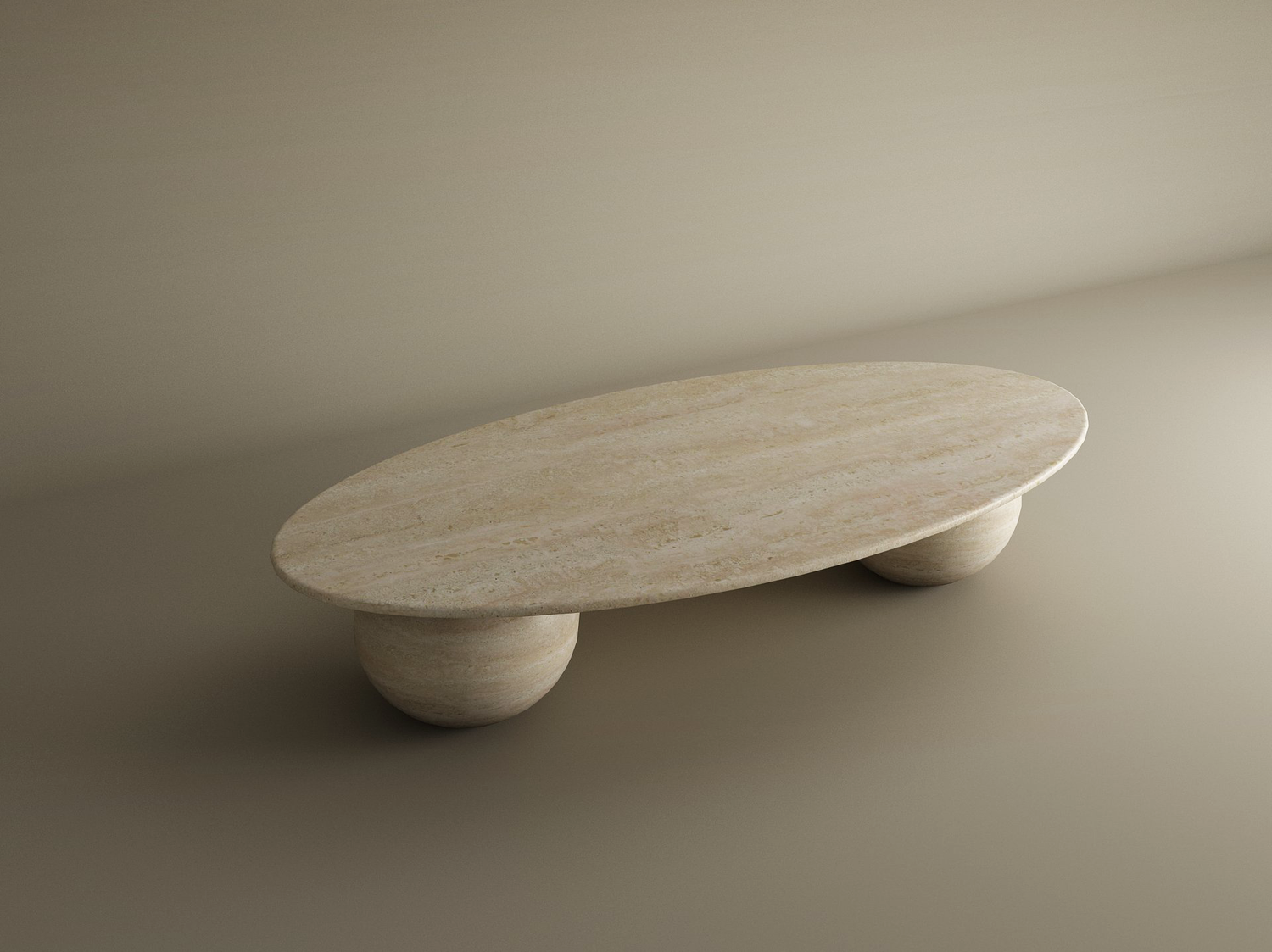 Ellipse travertine coffee table featuring sculptural stone ball bases that lend a dynamic, organic energy to the soft, flowing top. Sized at 55 x 27 x 14 inches (140 x 70 x 36 cm), this piece is both artistic and serene—an invitation to slow down, gather, and reflect.