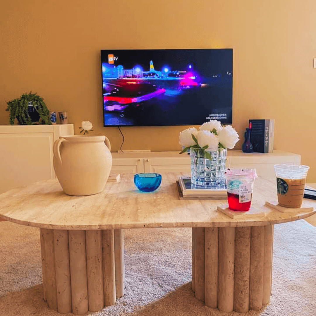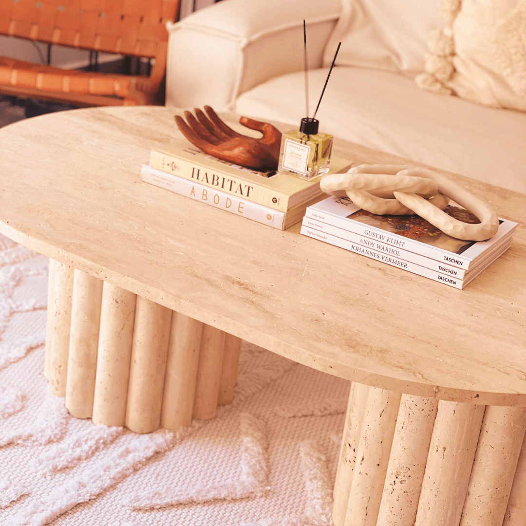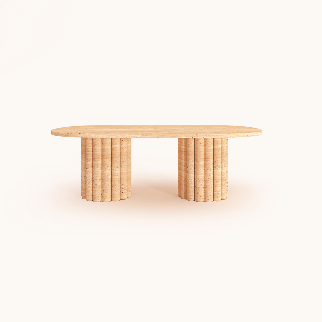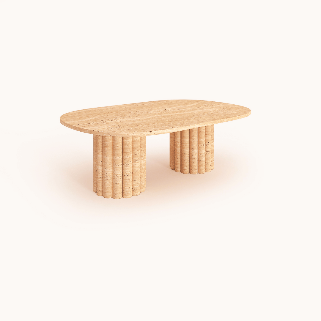 Experience the timeless elegance of craftsmanship with our Handcrafted Italian Travertine Coffee Table. This artisan-designed masterpiece stands out with its distinctive architectural presence, highlighted by multiple robust columns that support a sleek, ovular top. Made from the finest travertine sourced from Turkiye, this table epitomizes durability and style.