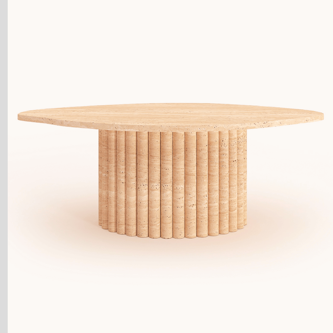 Imagine this exquisite Heritage Fluted Travertine Coffee Table taking center stage in your living room. Its design is a modern ode to classical architecture, featuring a circle of finely fluted columns that support a generously sized, round tabletop. This table is not just a place to rest your coffee; it's a conversation starter, a statement of artistry.