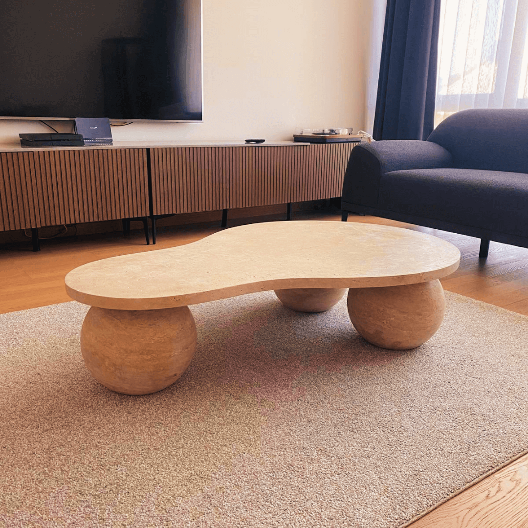 This table features an irregular organic shape, with one side extending to 80 cm (≈32"), offering a spacious surface for decor or everyday use. The narrower side tapers to 52 cm (≈20.5"), creating a soft, flowing silhouette that adds to its sculptural appeal. This dynamic design enhances both visual balance and functionality, making it a true statement piece in any space.