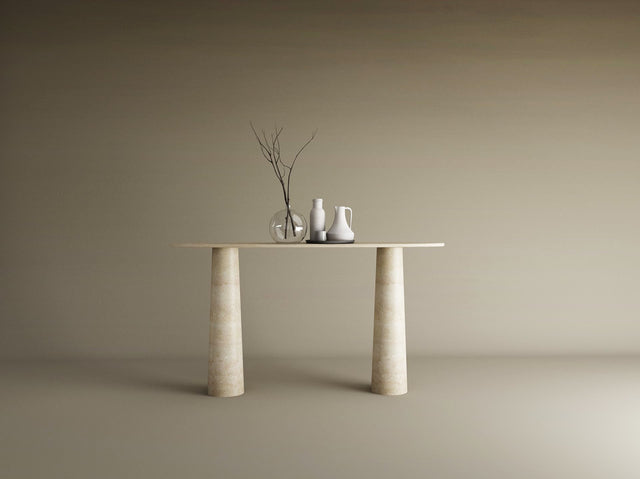 Ellips Travertine Console Table with Conical Pedestal Base – Organic Travertine Stone Base