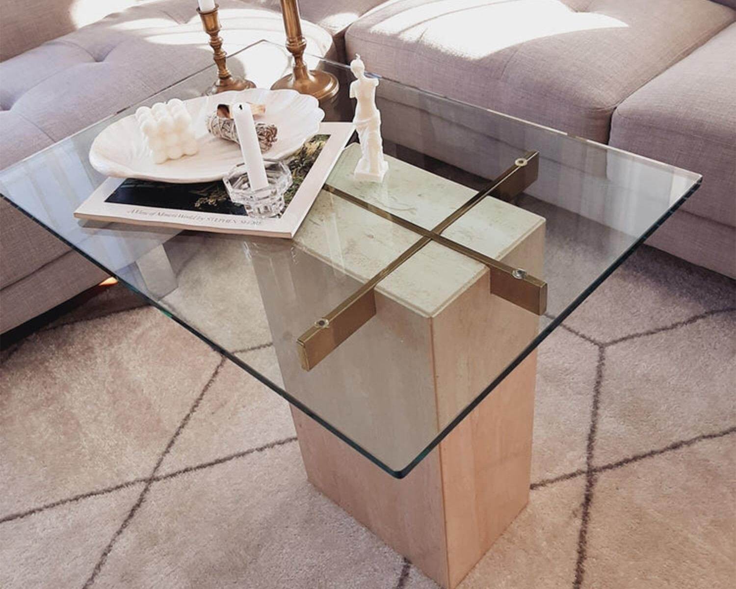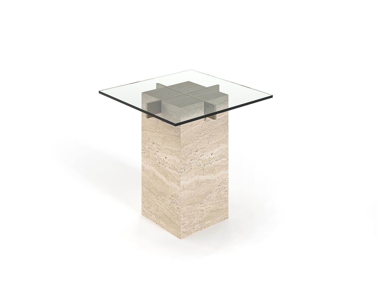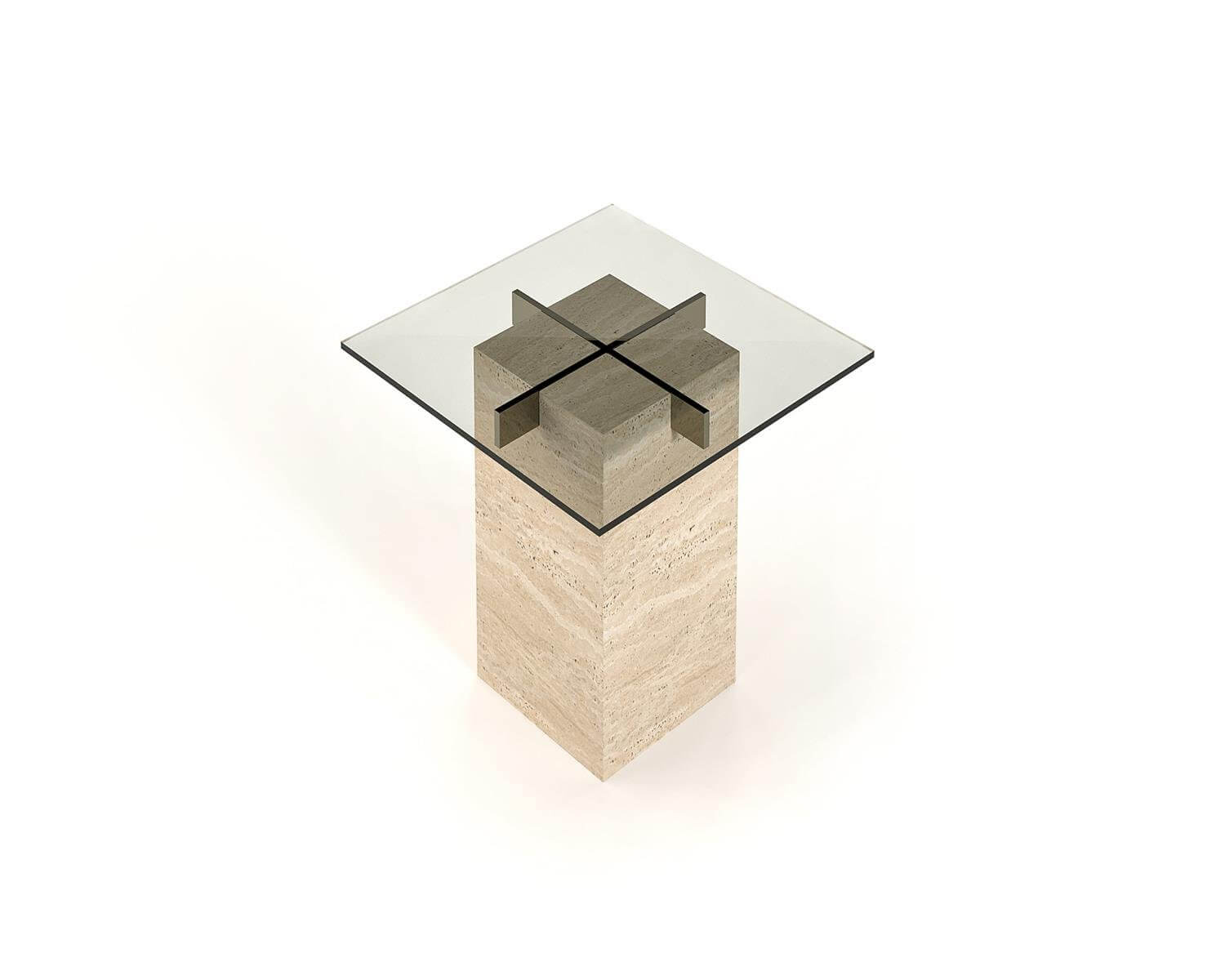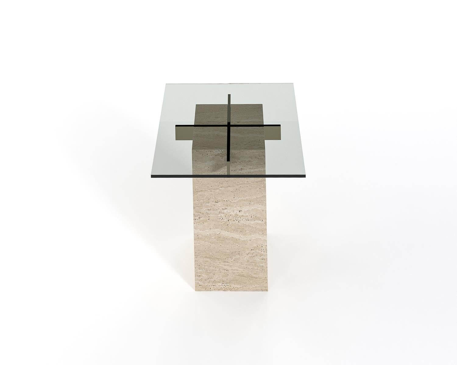 Crafted from 100% organic travertine, this table embraces contrast—the strength of solid stone meets the delicacy of glass. The square travertine base grounds the piece with timeless texture, while the elevated glass top adds lightness and refinement. A discreet architectural cross detail beneath the surface completes the design, making it a true modern statement for curated interiors.