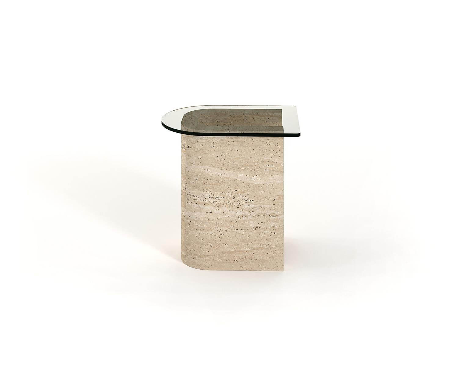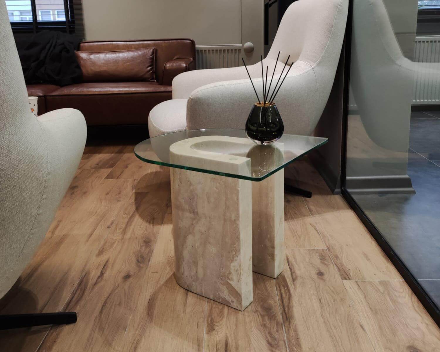 Introducing "LunaStone Accent Table" – the quintessence of functional art for contemporary spaces. Meticulously crafted from the finest travertine, this accent table marries the raw beauty of natural stone with the sleek sophistication of a glass top, delivering a piece that’s as sturdy as it is stylish.