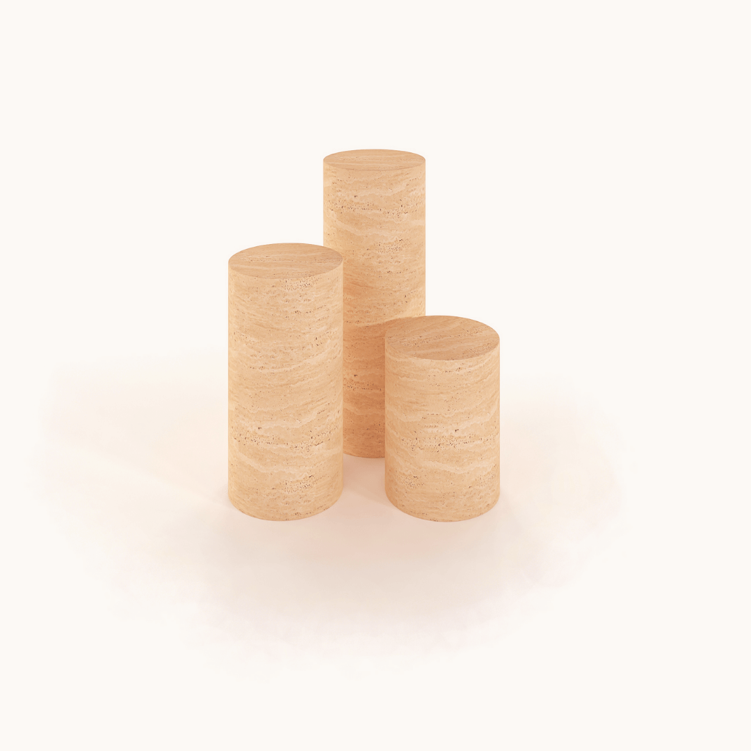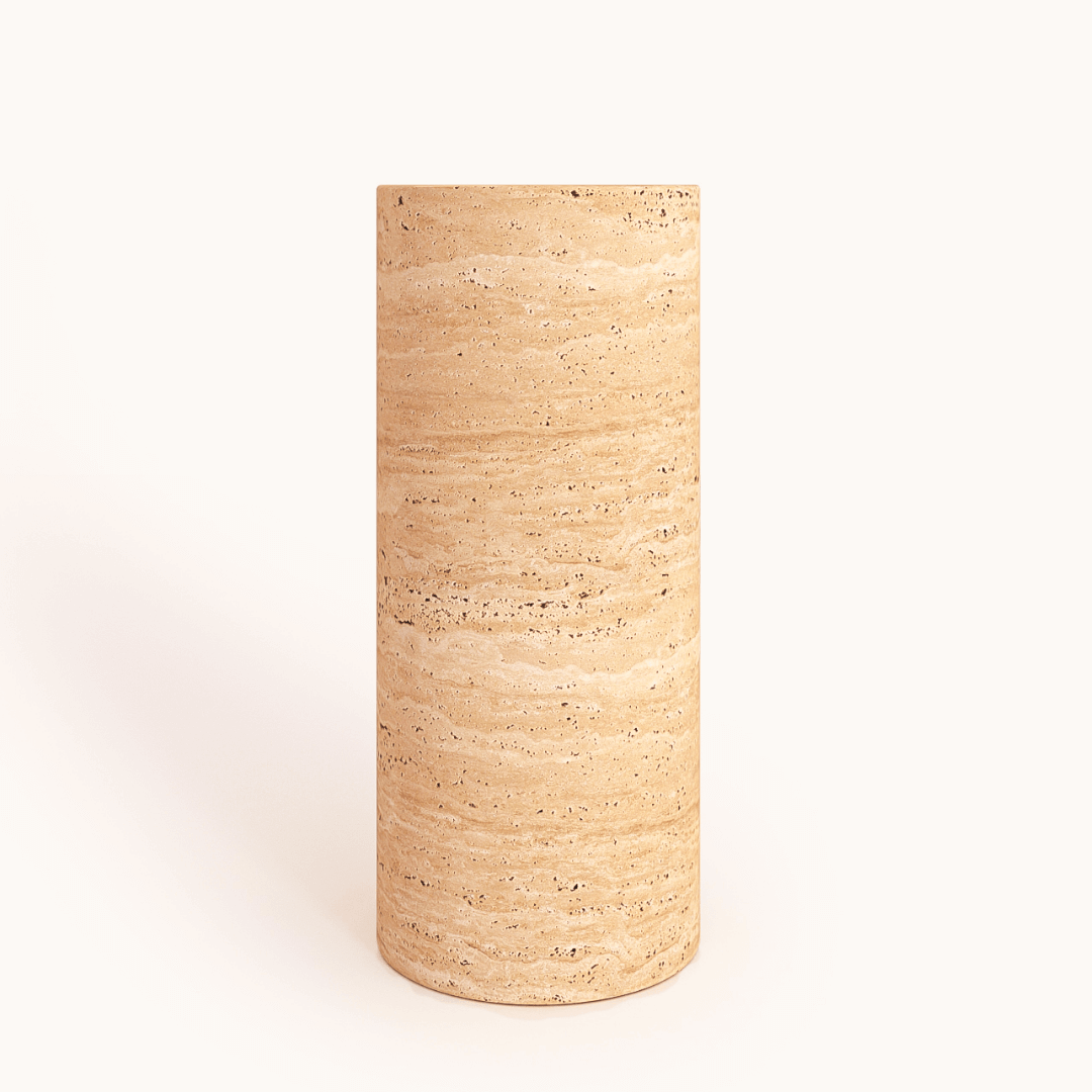 Carved from 100% organic travertine, this pedestal is both sculptural and versatile. Use it as a side table, a stand for decorative objects, or even as a statement piece on its own. The fully polished version highlights the rich natural veining of the stone, while the hand-chiseled variant embraces a wabi-sabi aesthetic, revealing the stoneβs unrefined, textural essence.