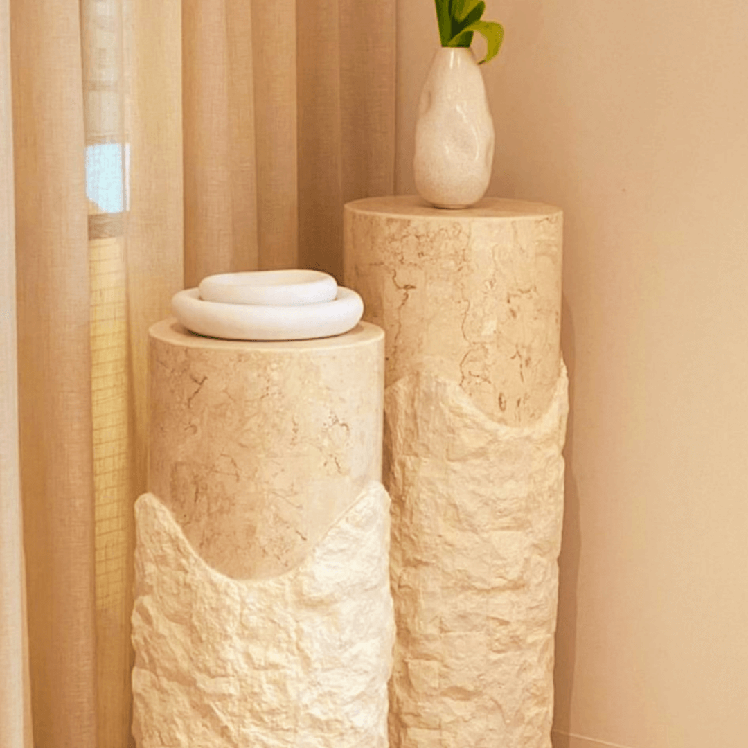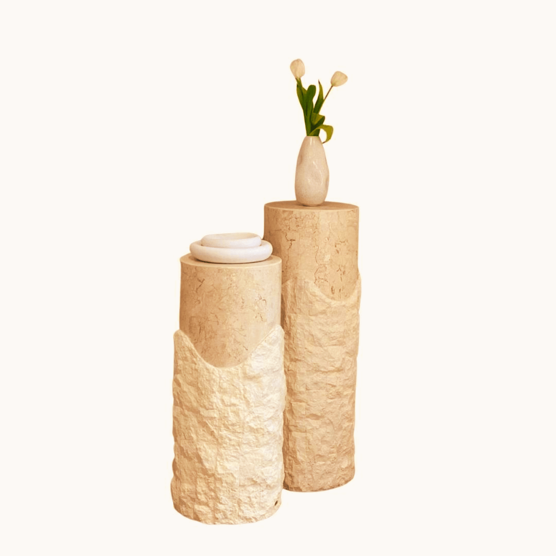 Now available in two distinct finishes, this pedestal allows you to choose between a fully smooth, minimalist version or a raw-textured, hand-chiseled edition. Both styles embody timeless elegance and work seamlessly in modern, rustic, or gallery-inspired interiors.