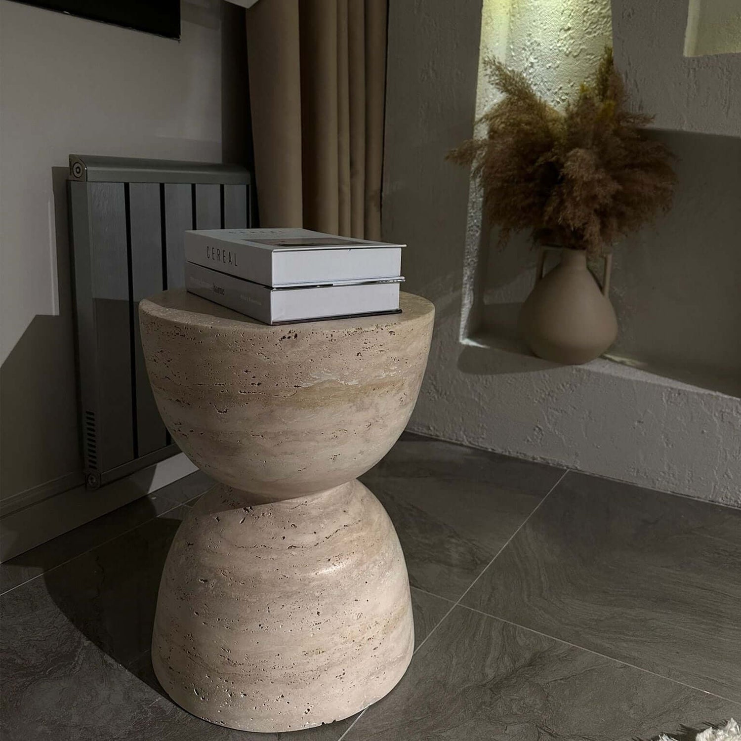 Crafted from 100% solid travertine, the Eda Beige Travertine Sphere Table is a bold yet refined accent piece that seamlessly blends sculptural form with organic texture. Its rounded silhouette exudes harmony, while the honed stone surface invites a tactile experience that is both grounding and luxurious. The symmetrical, hourglass-like design captures the essence of balance and fluidity, making it a statement table for curated interiors.