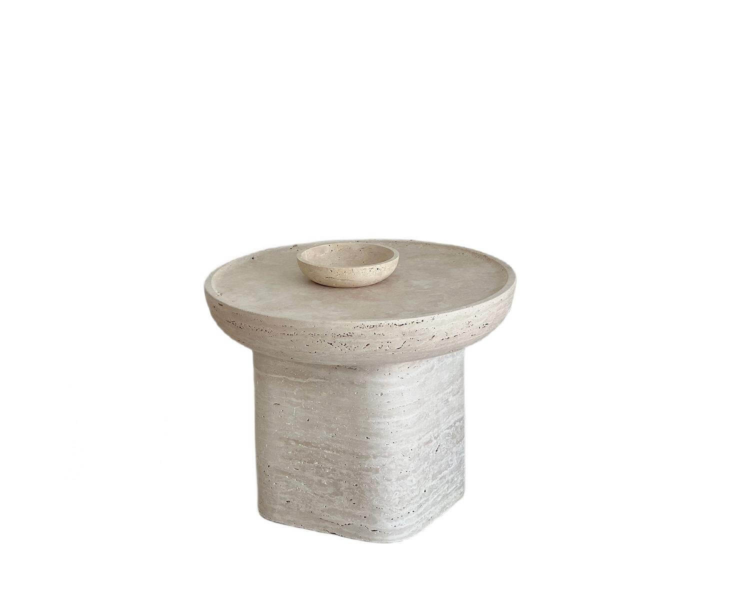 Crafted from 100% organic stone, this table embodies the raw, textured beauty of natural travertine while maintaining a refined, sculptural presence. The subtly curved edges and solid base create a harmonious balance, making it a versatile statement piece for contemporary interiors. The gently recessed top offers a functional yet artistic detail, echoing the design of ancient coastal vessels. Whether placed beside a lounge chair, sofa, or as a standalone accent, it seamlessly integrates into any setting, evoking the effortless elegance of Mediterranean living.