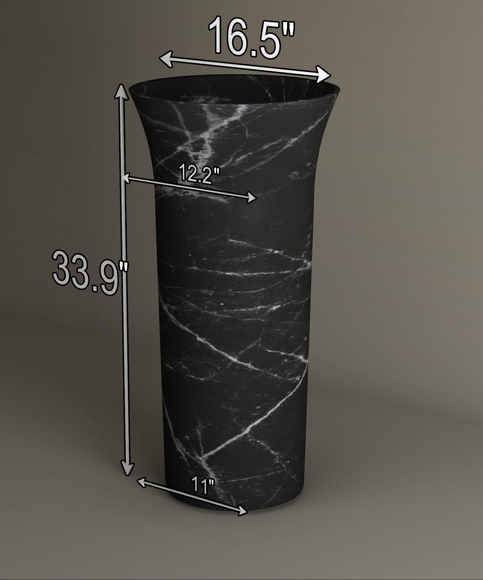 This sculptural vanity stands at 33.9" (860 mm) in height, with a 16.5" (420 mm) diameter at the rim that tapers gracefully to an 11" (280 mm) base. The inner basin measures 12.2" (310 mm) across, creating a refined balance between elegance and practicality.