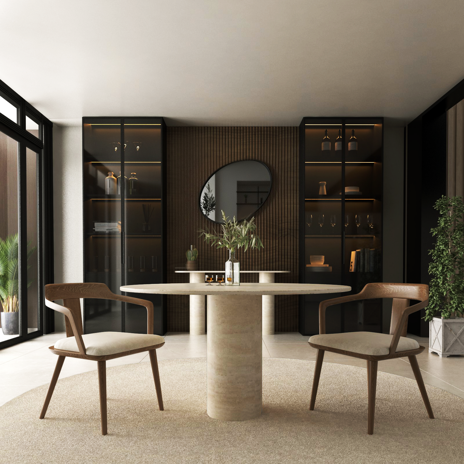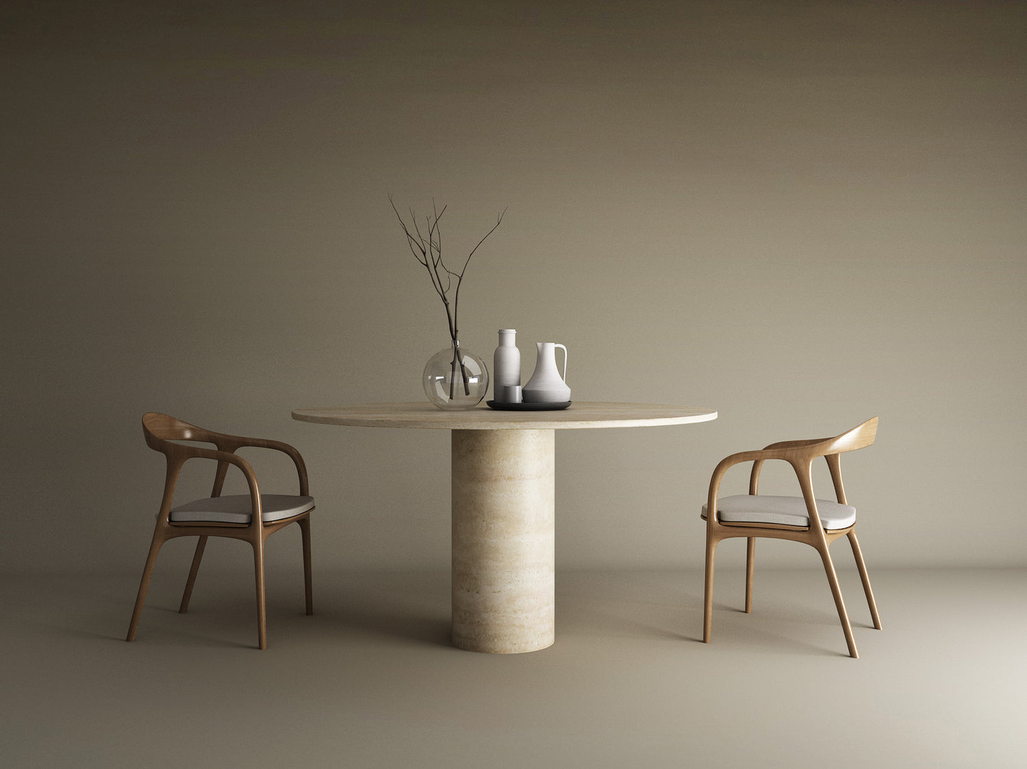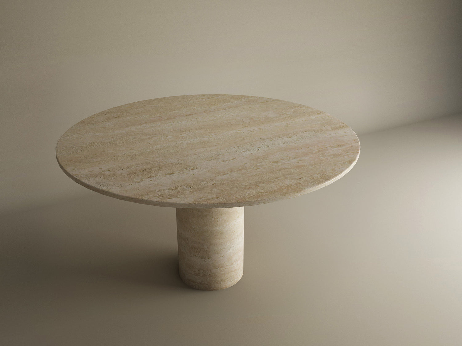 A soft, organic shape and a solid, fluted round single base define this Round travertine dining table. The warm veining of the stone top creates a welcoming surface for connection and conversation, while the base grounds it in quiet strength. Crafted from natural travertine and shaped by hand, this table brings a calm, lived-in luxury to your dining space—a place where memories can be shared for decades to come.