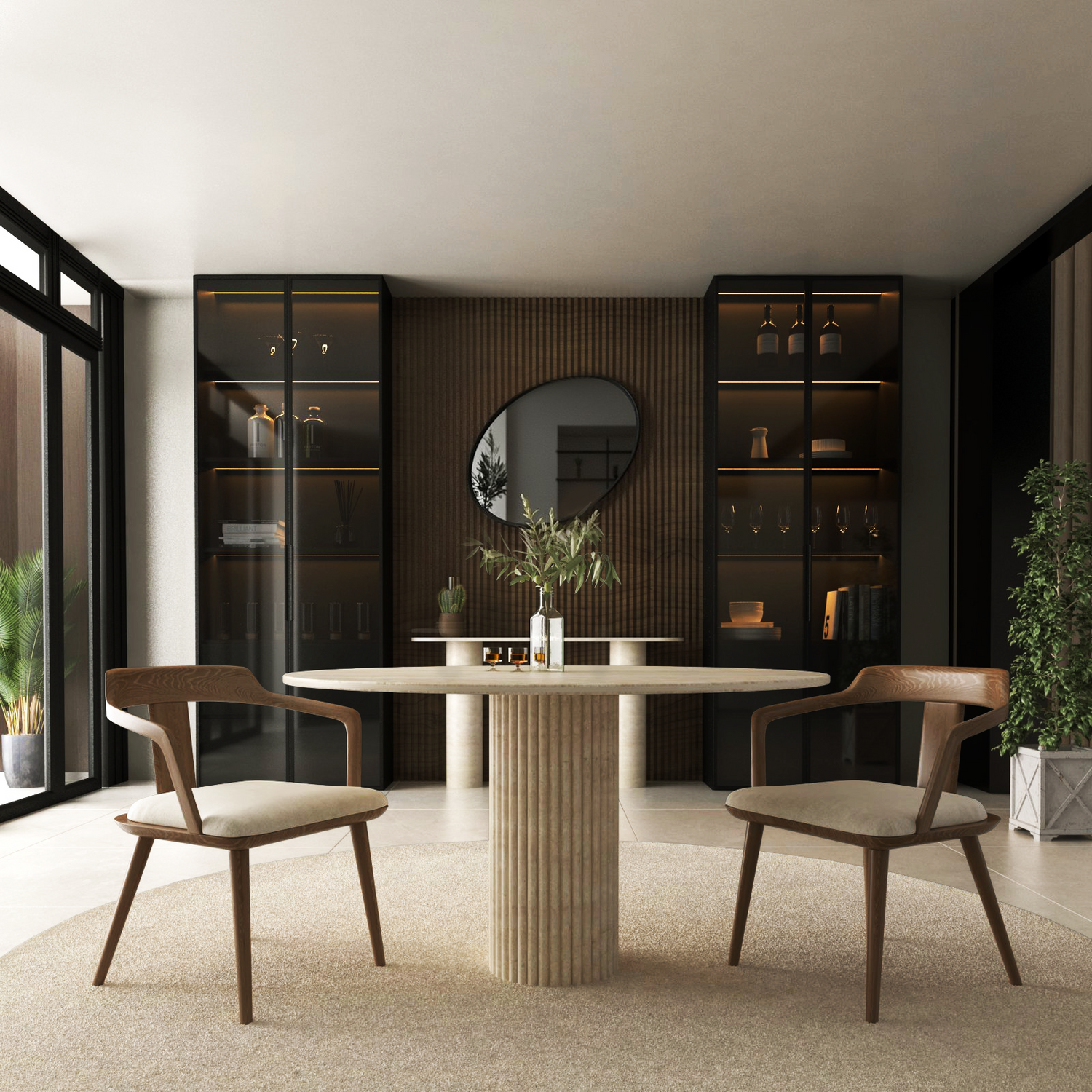 Round Travertine Dining Table with Fluted Round Center Base – Solid Travertine Stone – Customizable Dining Table is backordered and will ship as soon as it is back in stock.