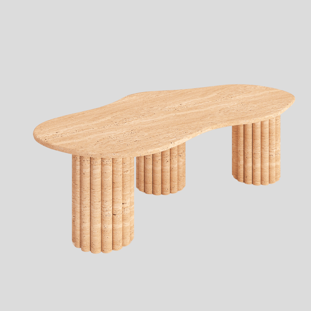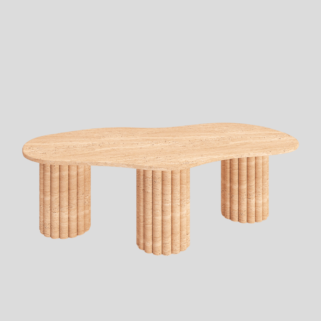 Featuring fluted cylindrical legs that draw inspiration from classical architecture, this table adds a sculptural element to your decor. The grooved detailing of the legs creates a unique play of light and shadow, enhancing the rich, textured surface of the travertine. These legs not only support the substantial oval top but also provide a stable base that anchors the room in style.
