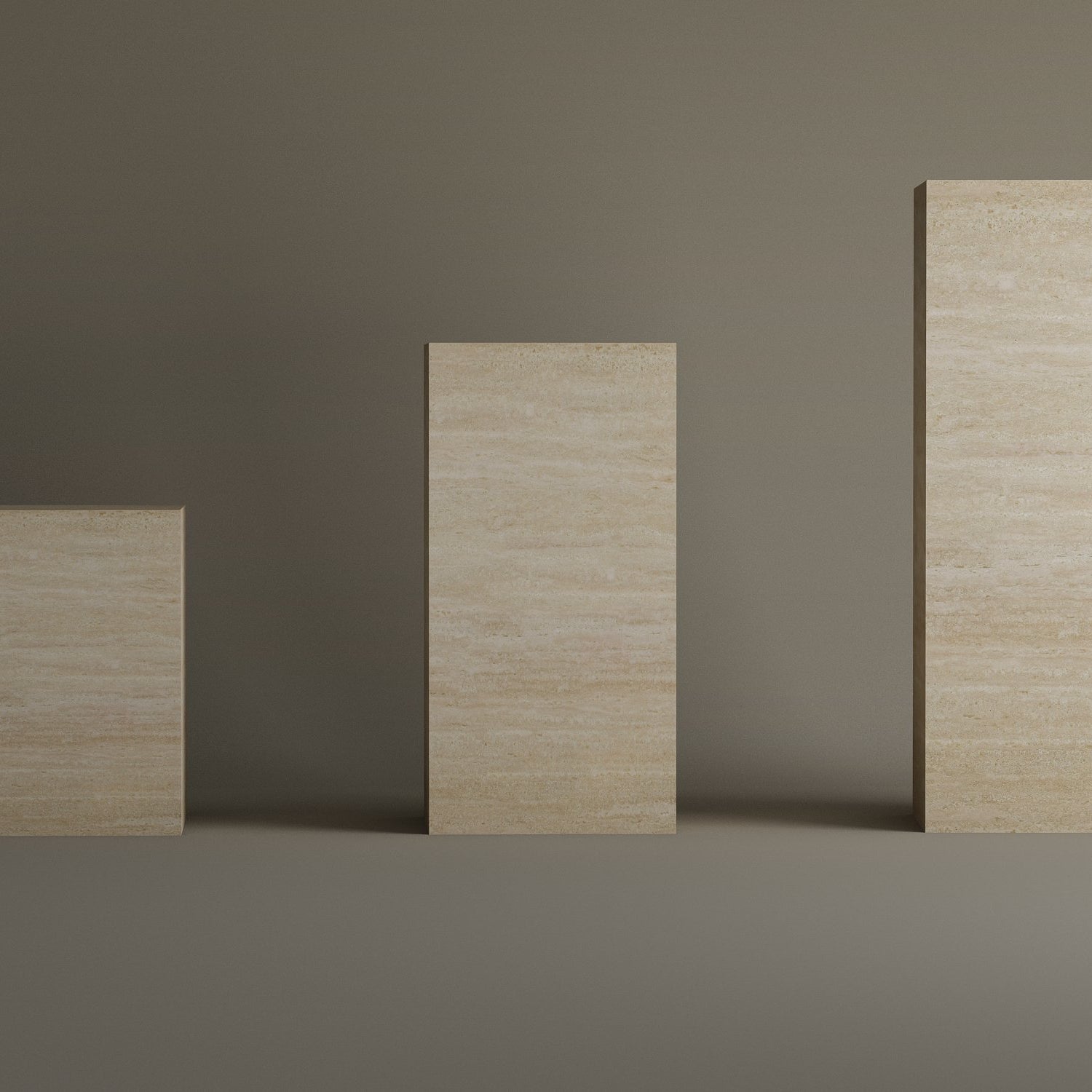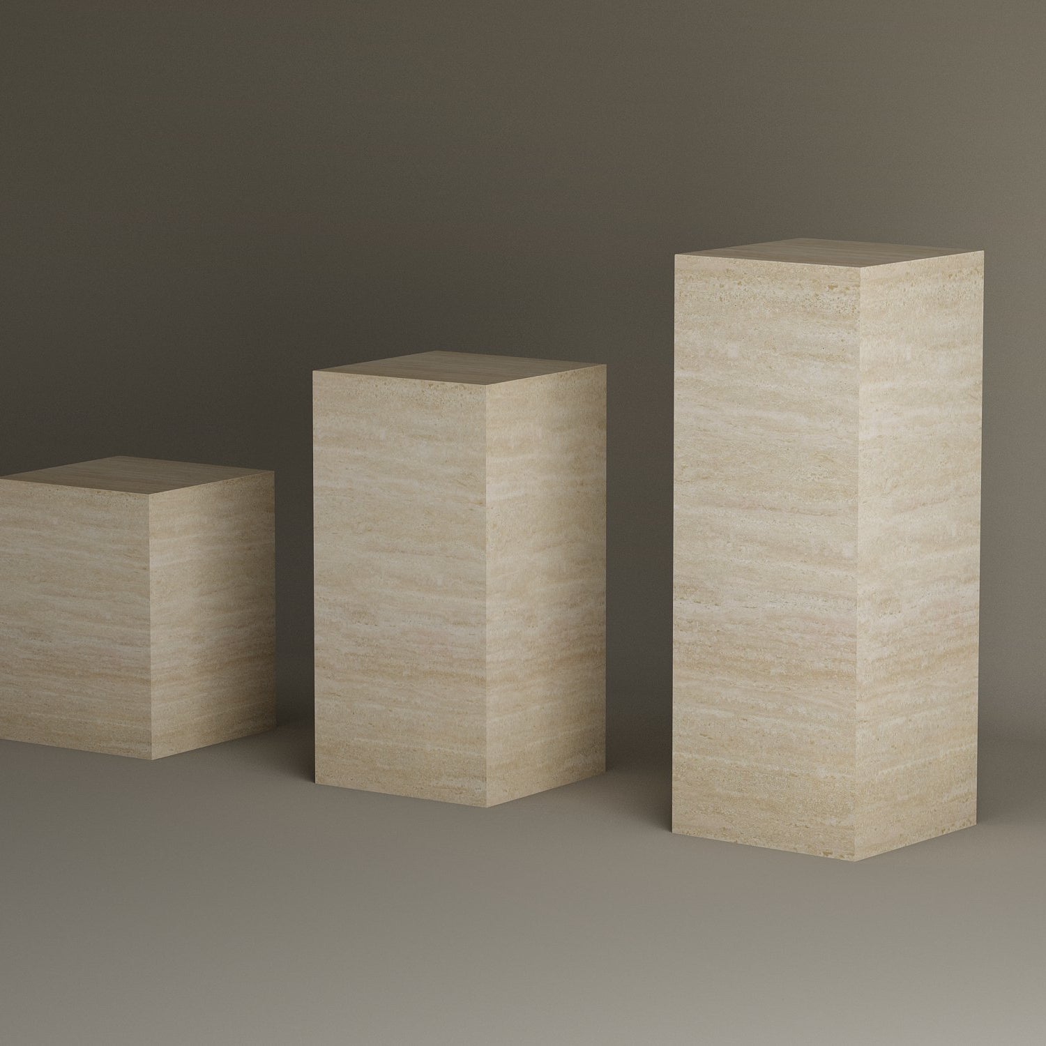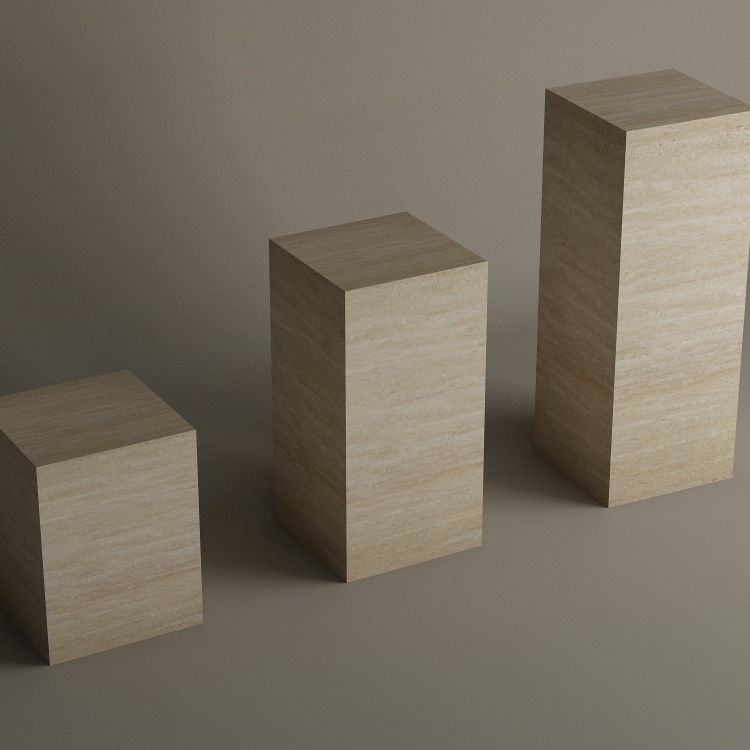 Crafted from 100% organic stone, this three-piece set embodies a seamless blend of function and form. The natural veining of the travertine tells a unique story, ensuring that no two sets are ever alike. With clean lines and a bold, monolithic presence, these sculptural pieces create depth and dimension in any space. Whether placed together for a striking centerpiece or styled separately, they serve as pedestals for art, plant stands, or side tables—each one a masterpiece on its own.