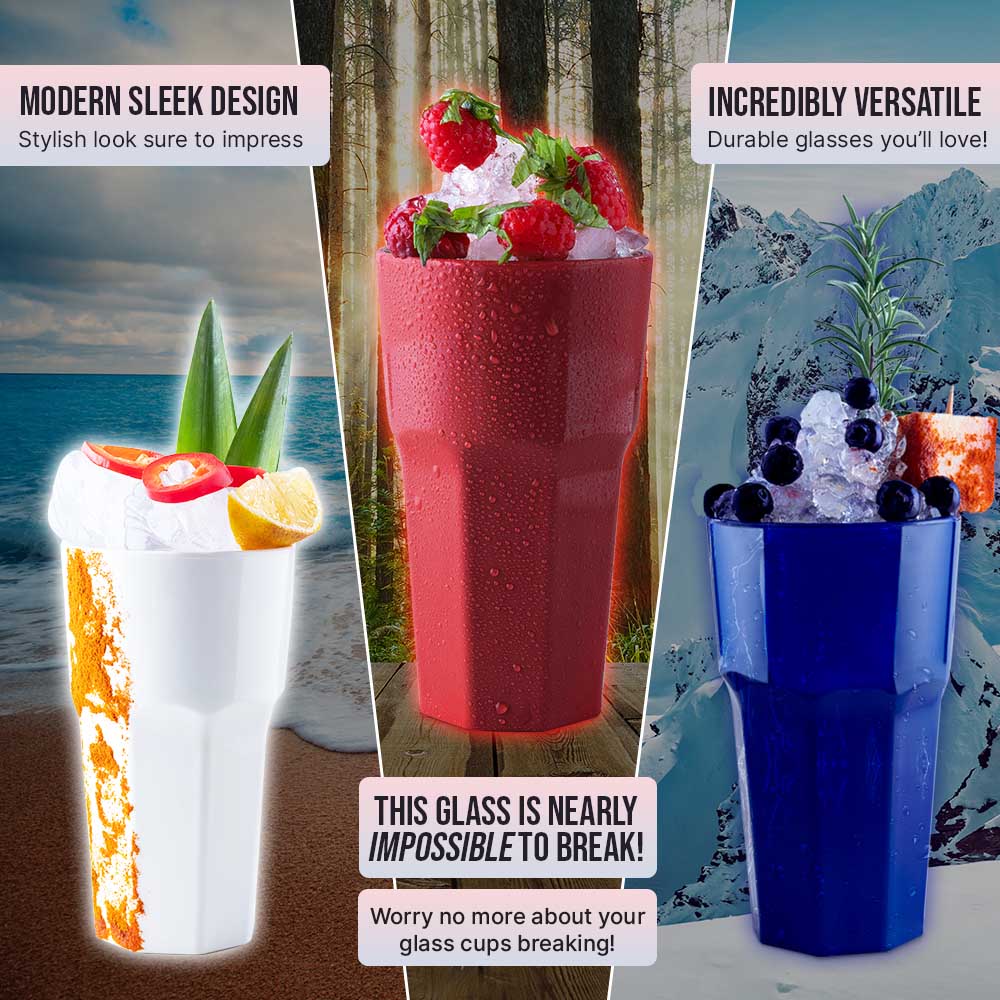 Unlike traditional glass or fragile acrylic drinkware, our USA-themed drinking glasses are made from high-impact polycarbonate, a material widely used in aviation, yacht construction, automotive manufacturing, and safety shields. Its incredible strength makes it the perfect choice for long-lasting drinkware.